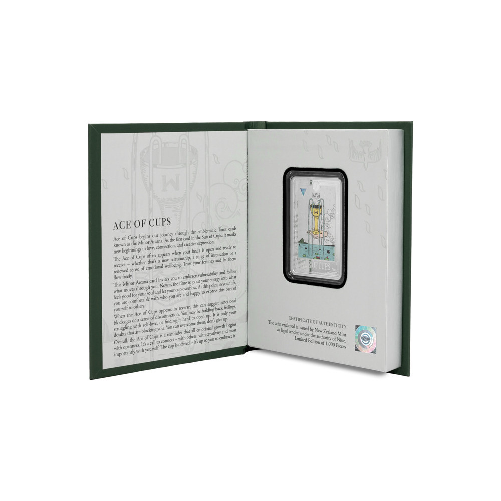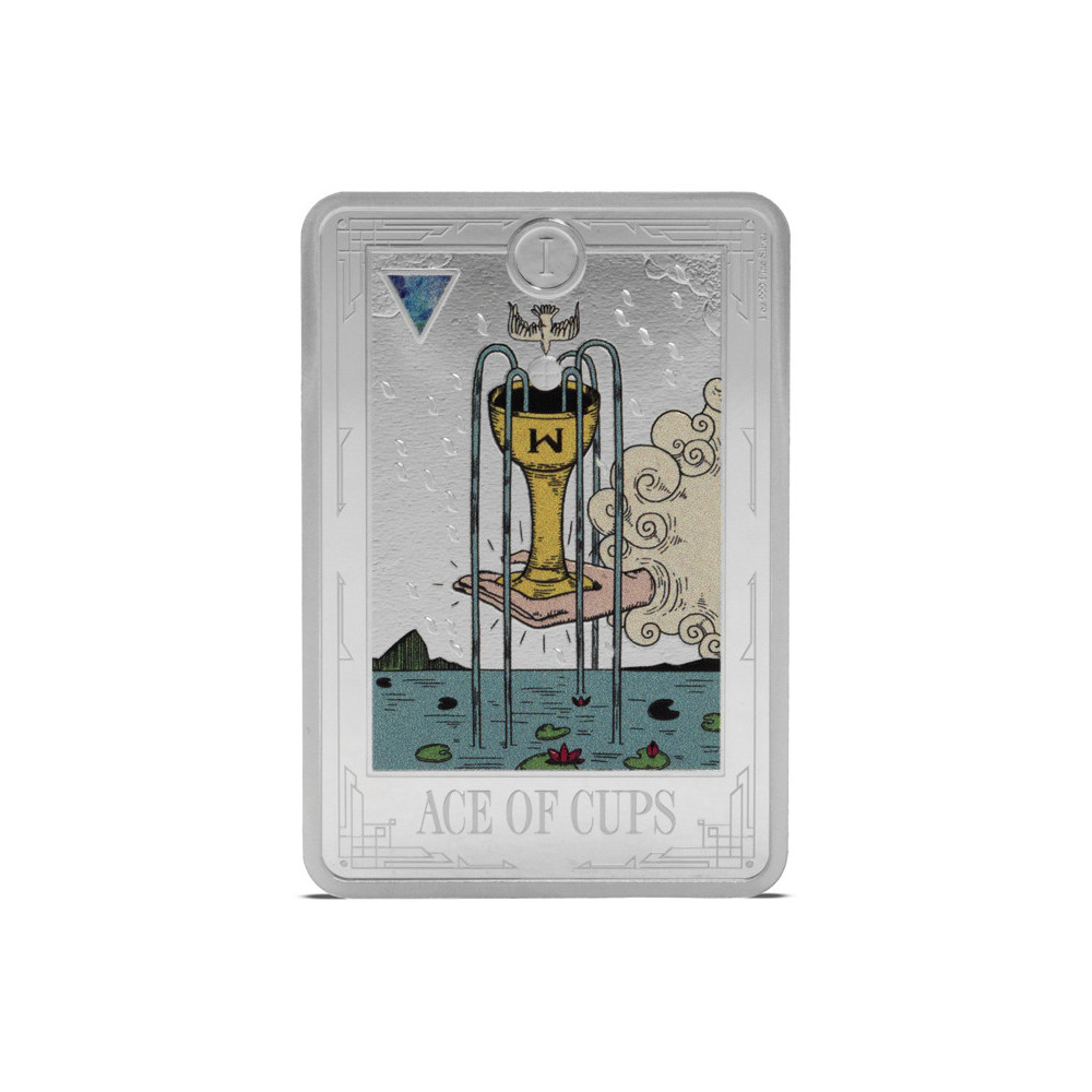 Ass der Kelche 1 Oz 2025 COLOR PROOF in Form von Spielkarten ist die erste Münze der Little Arcana Tarot Silbermünzen Sammlerserie der New Zealand Mint.