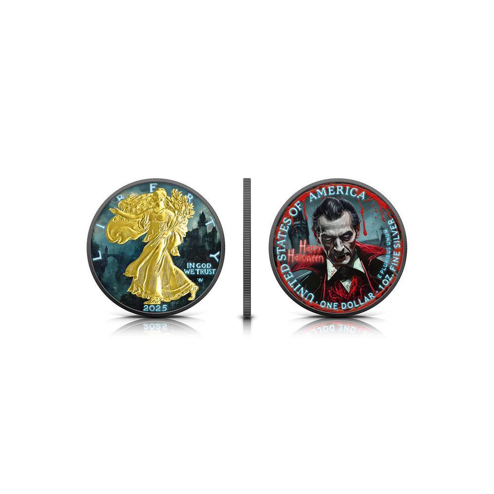 USA 2025 - Moneda de Plata American Eagle de 1 oz - Príncipe de la Noche (oro, rutenio, color) es una moneda premium de edición limitada emitida para Halloween. Cada moneda está fabricada con 1 oz de auténtica plata American Eagle (pureza 999) y tratada después de la acuñación con un baño selectivo de oro y rutenio y vibrantes colores para conseguir un espectacular aspecto coleccionable. La moneda está limitada a 300 piezas en todo el mundo y se entrega en una cápsula protectora Quadrum con embalaje personalizado y especificaciones completas.