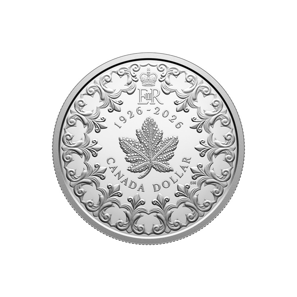 Este dólar de plata con una pureza del 99,99% conmemora el centenario del nacimiento de la reina Isabel II y presenta un homenaje exclusivamente canadiense: una representación del broche de diamantes en forma de hoja de arce que lucía la reina Isabel II como símbolo de su relación personal con Canadá, completado con el monograma real (arriba) que le servía de emblema personal. La noble hoja está coronada con adornos de filigrana que simbolizan la gracia y el legado, e incluye 13 hojas de arce (una por cada provincia y territorio) engarzadas en el espacio negativo de la filigrana: un homenaje sutil pero profundo que impregna la obra de arte, al igual que la inquebrantable presencia de la reina Isabel II en la historia de Canadá.