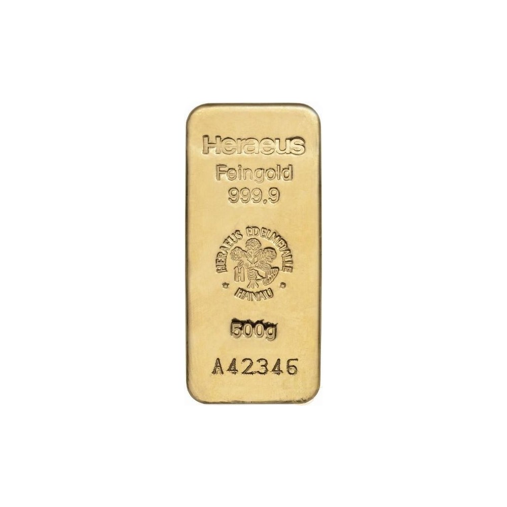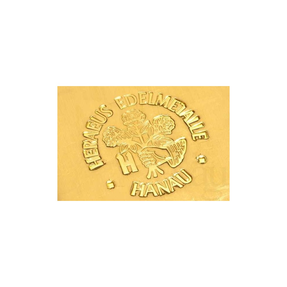 Este lingote de oro puro fundido de 500 gramos se compone del oro más puro 999,9 y está fabricado por Heraeus Metals Germany GmbH & Co. KG. Con sede en Hanau, cerca de Fráncfort, Heraeus opera en todo el mundo y es una empresa familiar desde hace más de 160 años. Junto con su holding suizo Argor-Heraeus, Heraeus es uno de los mayores productores de lingotes de oro y otros metales preciosos de Europa y del mundo. Heraeus fue fundada a mediados del siglo XIX por una familia de boticarios que desarrollaron un proceso para fundir platino utilizando oxígeno e hidrógeno. Argor SA se fundó en 1951 en el cantón suizo de Tesino. En 1973, la empresa pasó a ser propiedad al 100% de UBS. En 1986 se creó una empresa conjunta con Heraeus. Los lingotes de oro de 500 g suelen fundirse en un molde de Heraeus. El lingote lleva estampado el característico escudo de Heraeus, que tiene como motivo una mano llena de rosas. A esto se añade la estampación del peso, la pureza del oro y el número de serie único. Los lingotes de oro Heraeus están certificados por la LBMA, lo que significa que figuran en la denominada Lista de Buena Entrega de la LBMA. De este modo, todos los lingotes de metales preciosos cumplen la norma internacionalmente reconocida "London Good Delivery Standard", que garantiza características en relieve o estampadas como la finura y el peso, así como un almacenamiento permanente e ininterrumpido en almacenes aceptados, de modo que los lingotes pueden negociarse en bancos de todo el mundo sin restricciones. Los lingotes se precintan en papel de aluminio con certificado y número de serie.