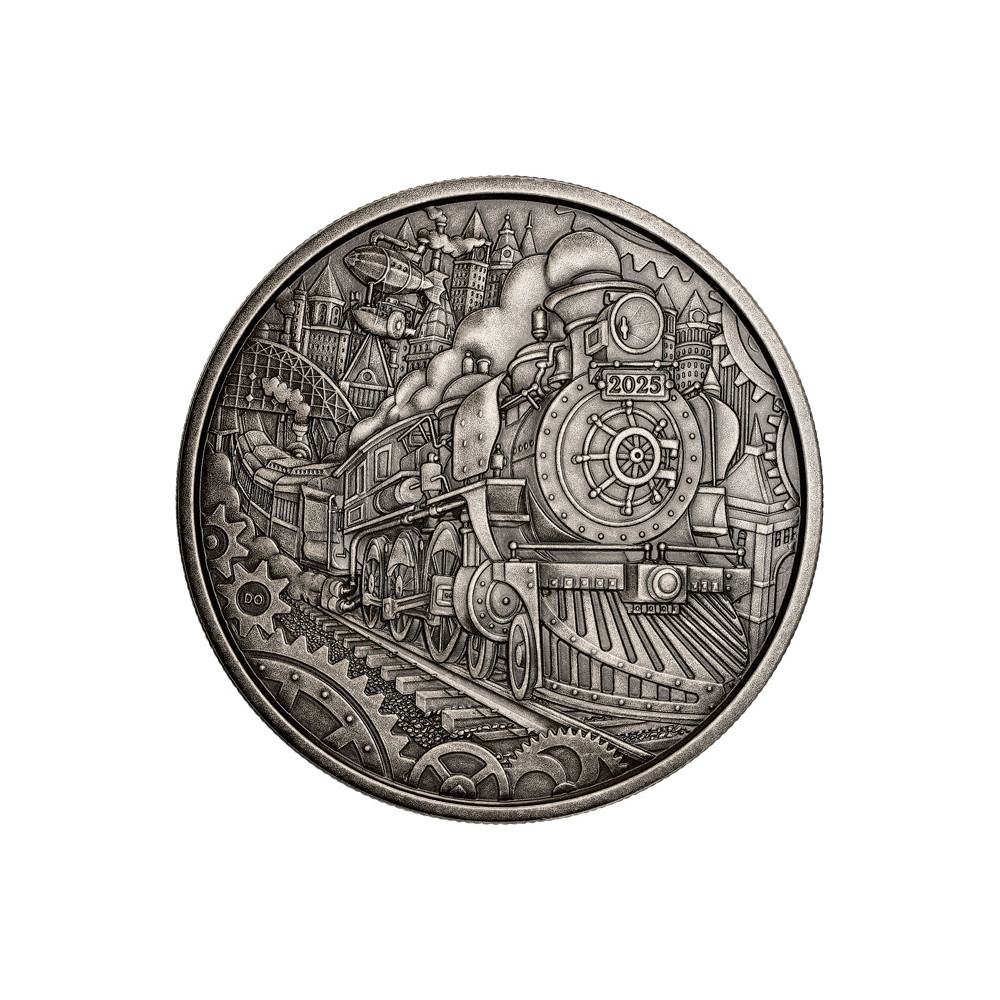 Canada Coin: Fantastic Story - Steam Locomotive 3 Oz Silver 2025 Antiqued Coin transports collectors to a retro-futuristic world where fantasy meets 19th century industrial aesthetics. A stylized steam locomotive travels through a fantastical Victorian cityscape that comes to life with depth of perspective, masterful engraving and extraordinary details that blur the lines between eras. The antiquing finish gives the coin the character of a long-held artifact from an alternate timeline. The design is a tribute to the optimism and creative art of the 19th century, which imagined a world powered by steam and imagination.