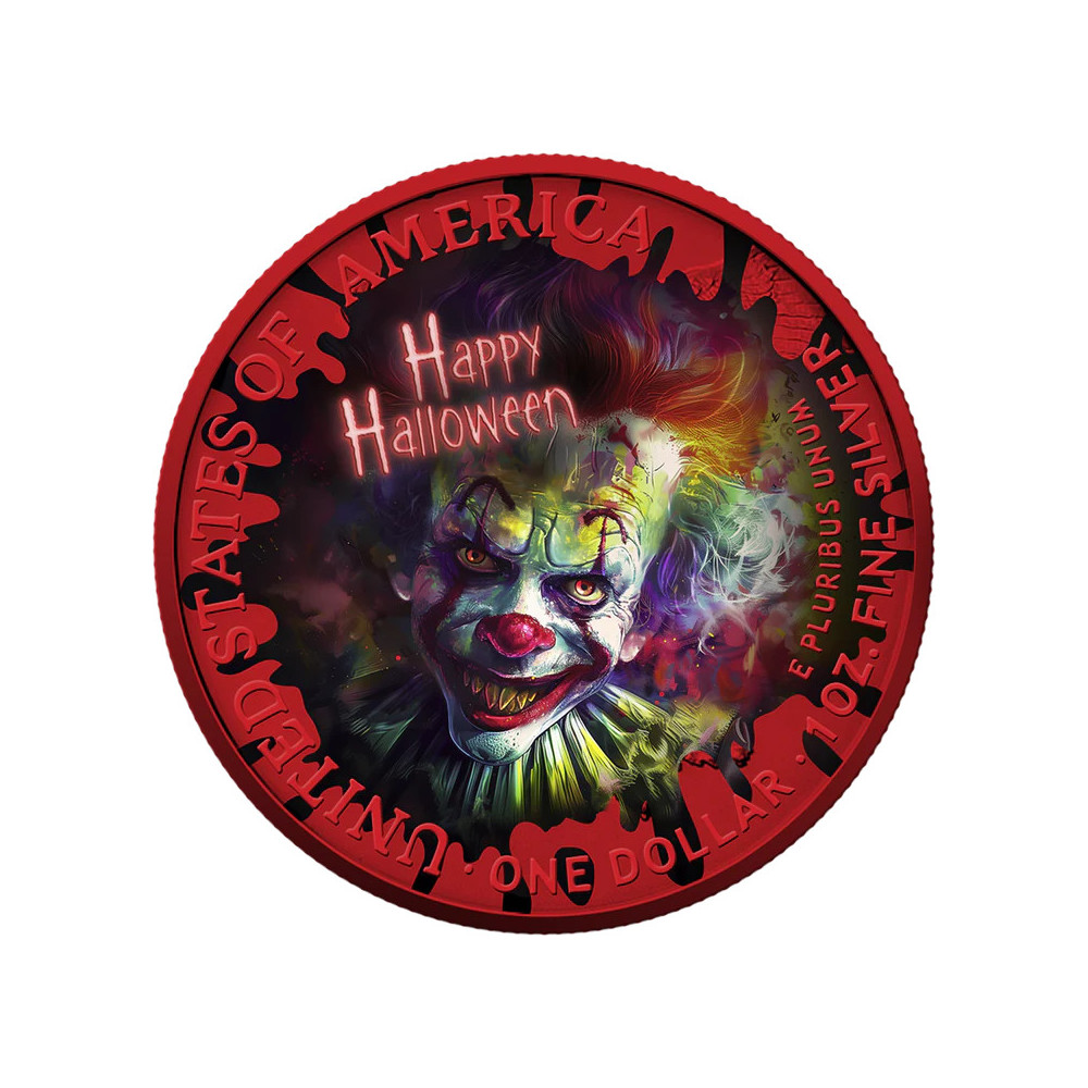 USA 2025 - American Eagle 1 oz Silver Coin - Creepy Smile (gold, space red, color) is a premium limited edition Halloween coin inspired by famous nightmare characters. Each coin is crafted from 1 oz of genuine American Silver Eagle (.999 purity) and then treated with vivid colors, Space Red effect and selective gilding after minting for a striking collectible look. This edition is limited to 300 pieces worldwide and comes in a protective Quadrum capsule with personalized packaging with matching artwork and specifications.