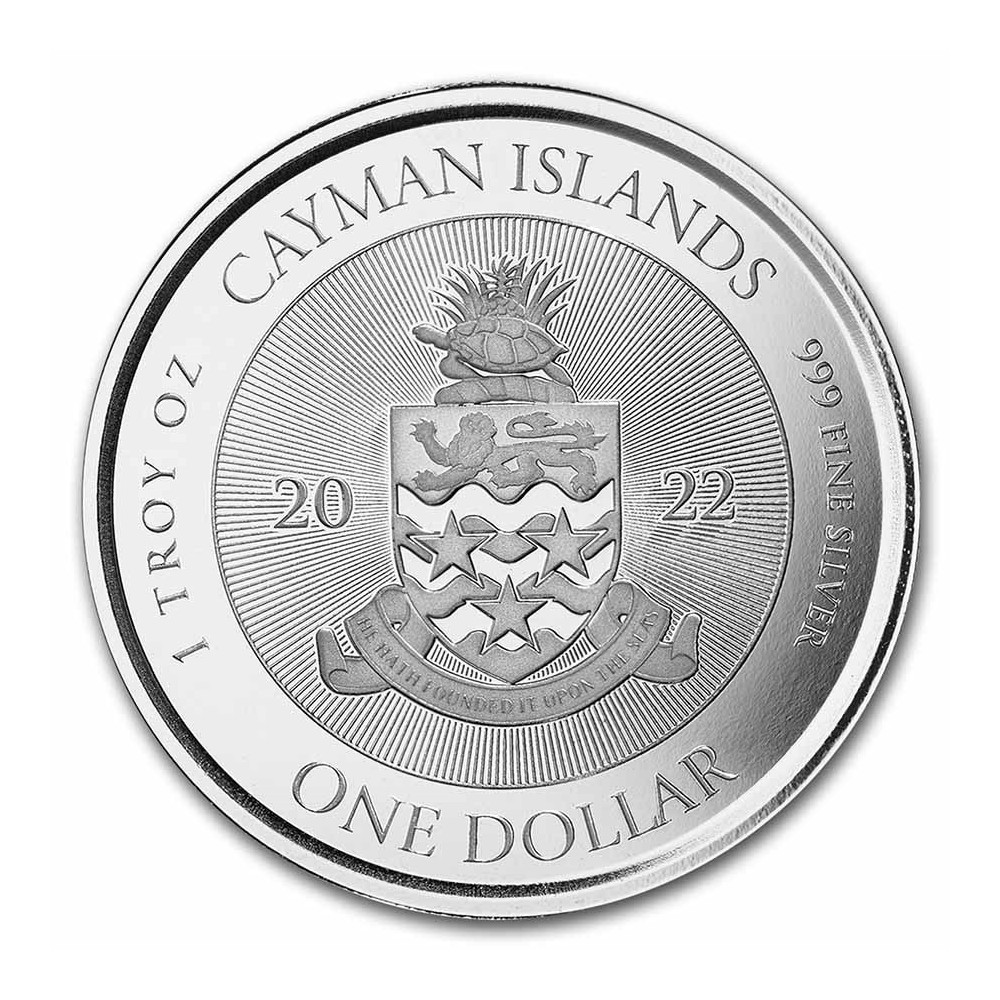 Shows the coat of arms of the Cayman Islands along with the metal weight, purity and face value.