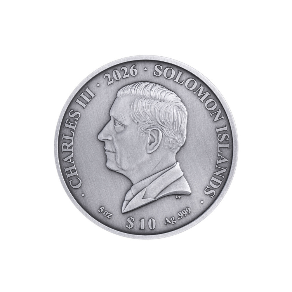 Intorno alla moneta si trovano le iscrizioni CHARLES III - il nome del re, SOLOMON ISLANDS - il paese di emissione, Ag 999 - la purezza dell'argento, $10 - il valore nominale e 5 oz - il peso della moneta.