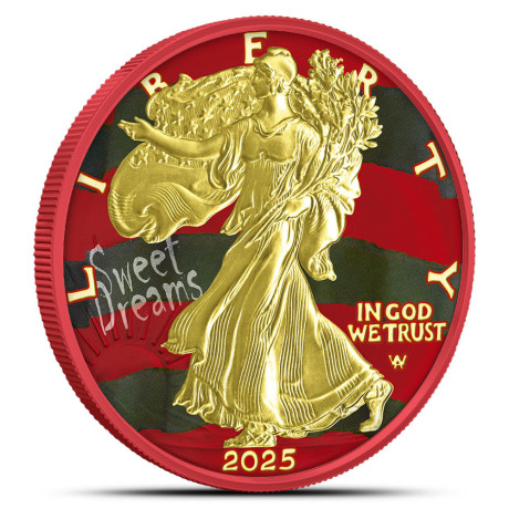 Il rovescio delle monete d'argento American Silver Eagle Claws of Fear 2025 presenta un disegno colorato ispirato al personaggio di Freddy Krueger. Il motivo raffigura la famosa camicia rossa e nera, il berretto nero sulla testa del personaggio e i terrificanti artigli nella sua mano.