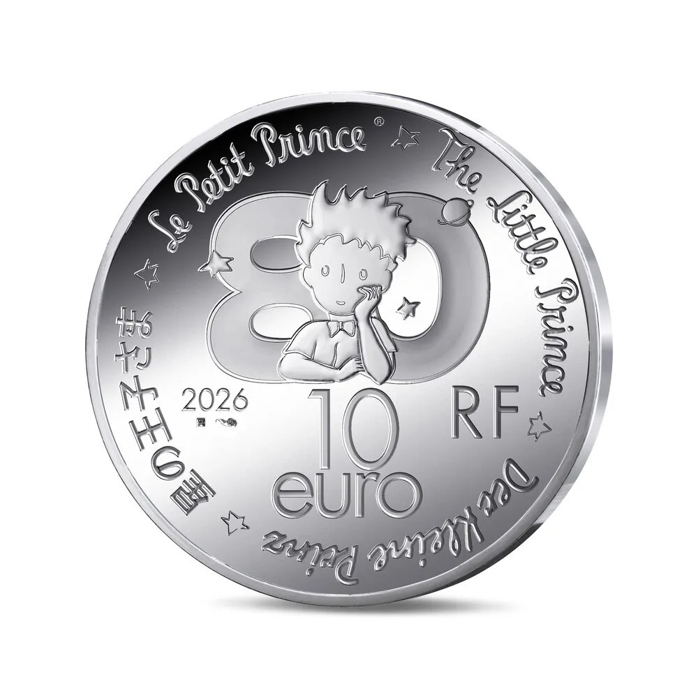 Sul rovescio della moneta, al di sopra del taglio, il logo dell'80° anniversario del Piccolo Principe, che consiste in un busto del personaggio appoggiato al braccio davanti al numero 80. Lungo il bordo, l'iscrizione "Le Petit Prince" in francese, inglese, tedesco e giapponese ricorda la dimensione universale di questa figura. Sono inoltre presenti le lettere RF, i marchi dell'atelier e del maestro incisore e l'anno 2026.