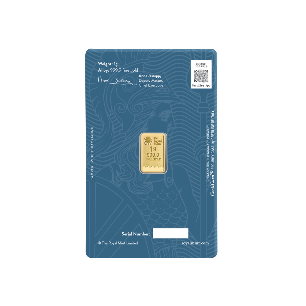 Questo lingotto d'oro contiene 1 g di oro fino 999,9 ed è un'inconfondibile incarnazione dell'orgoglio e del coraggio britannico.